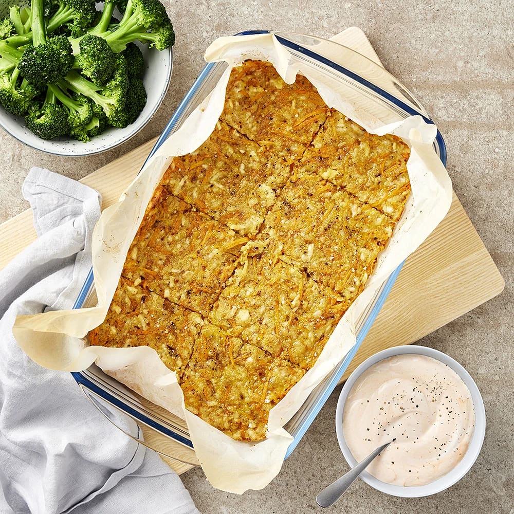 Halloumi och morotsbiffar i långpanna