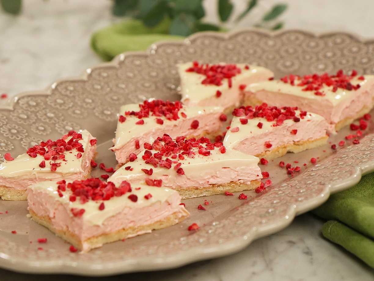 Vit chokladbiskvi med hallon i långpanna