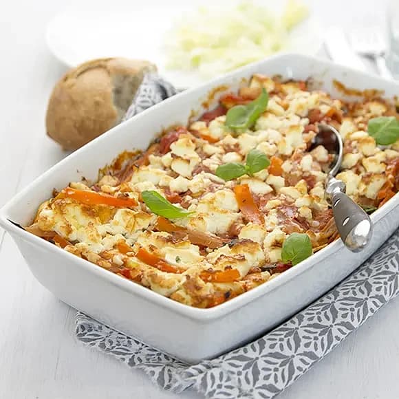 Vegetarisk lasagne med fetaost och oliver