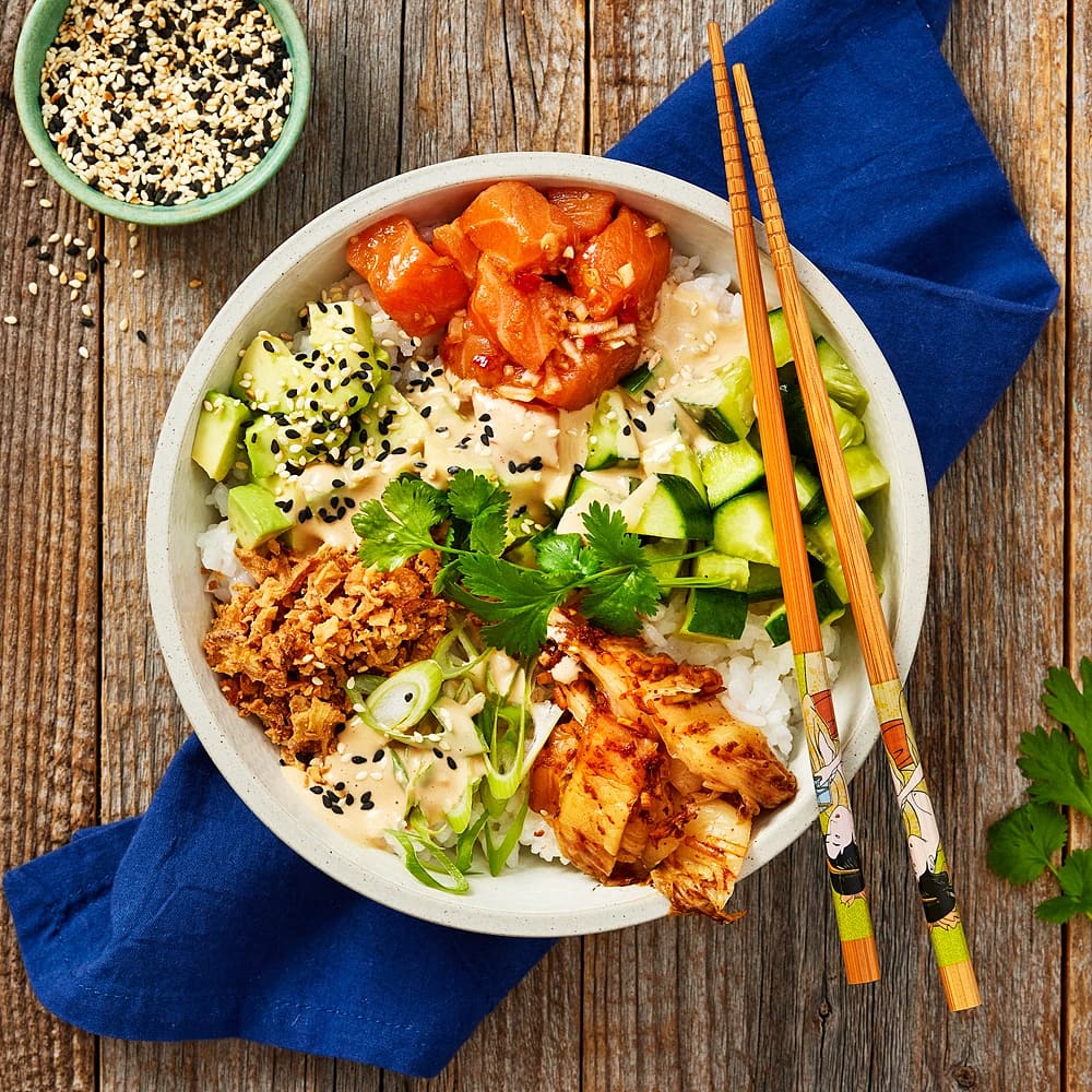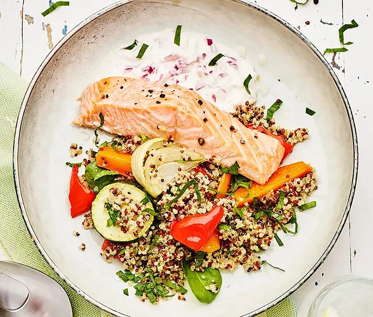 Quinoasallad med rostade grönsaker, lax och rödlökskvarg