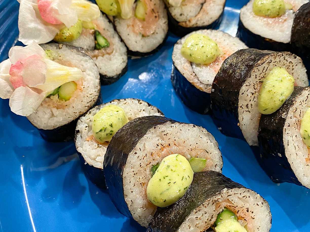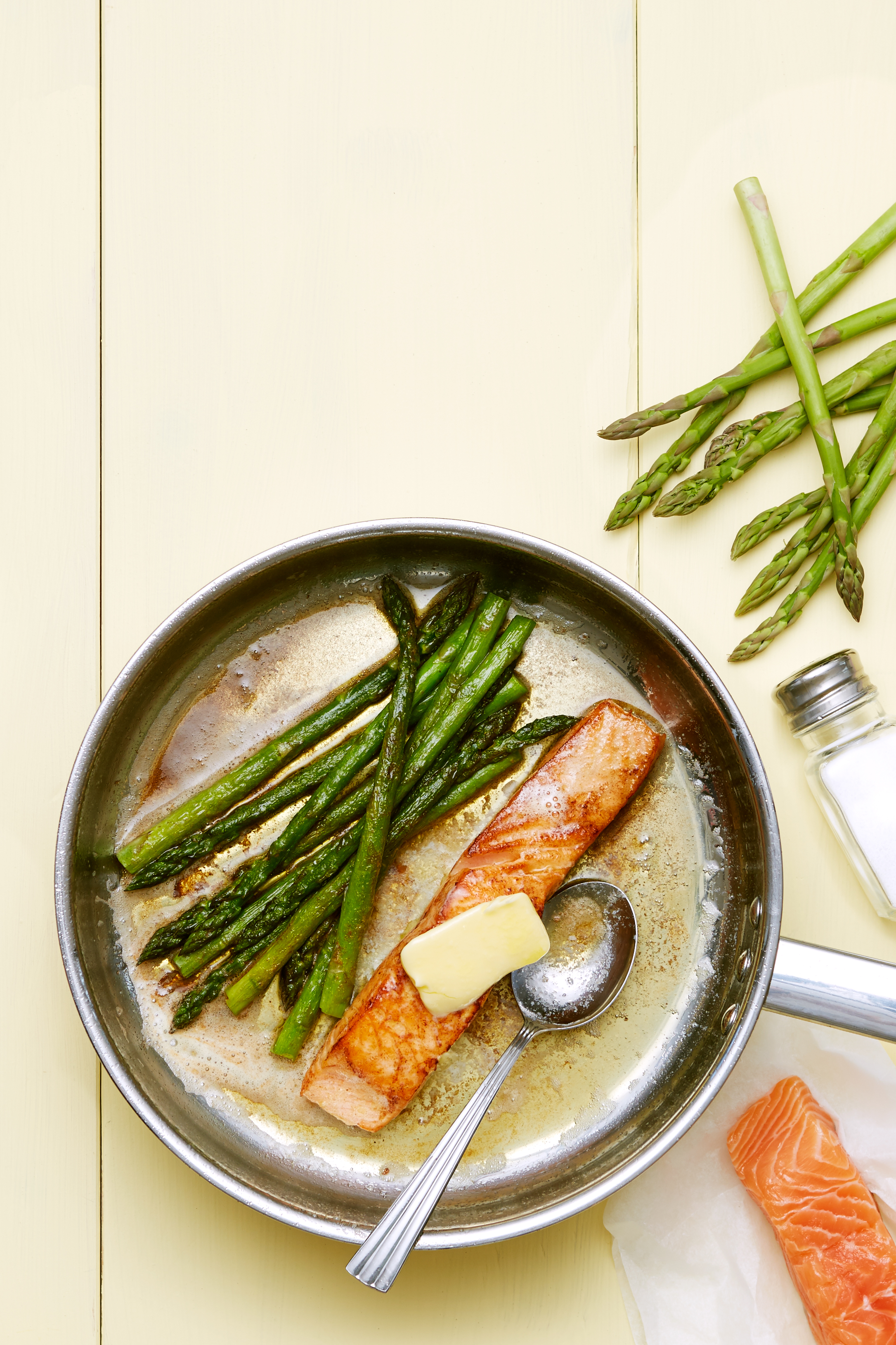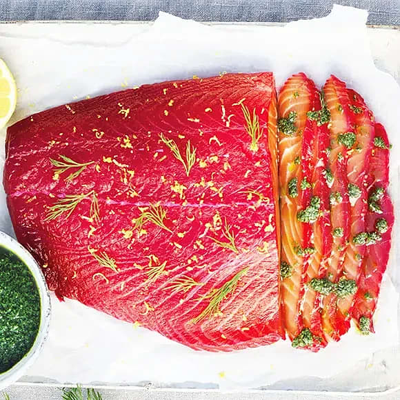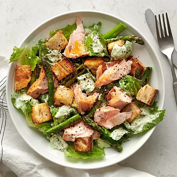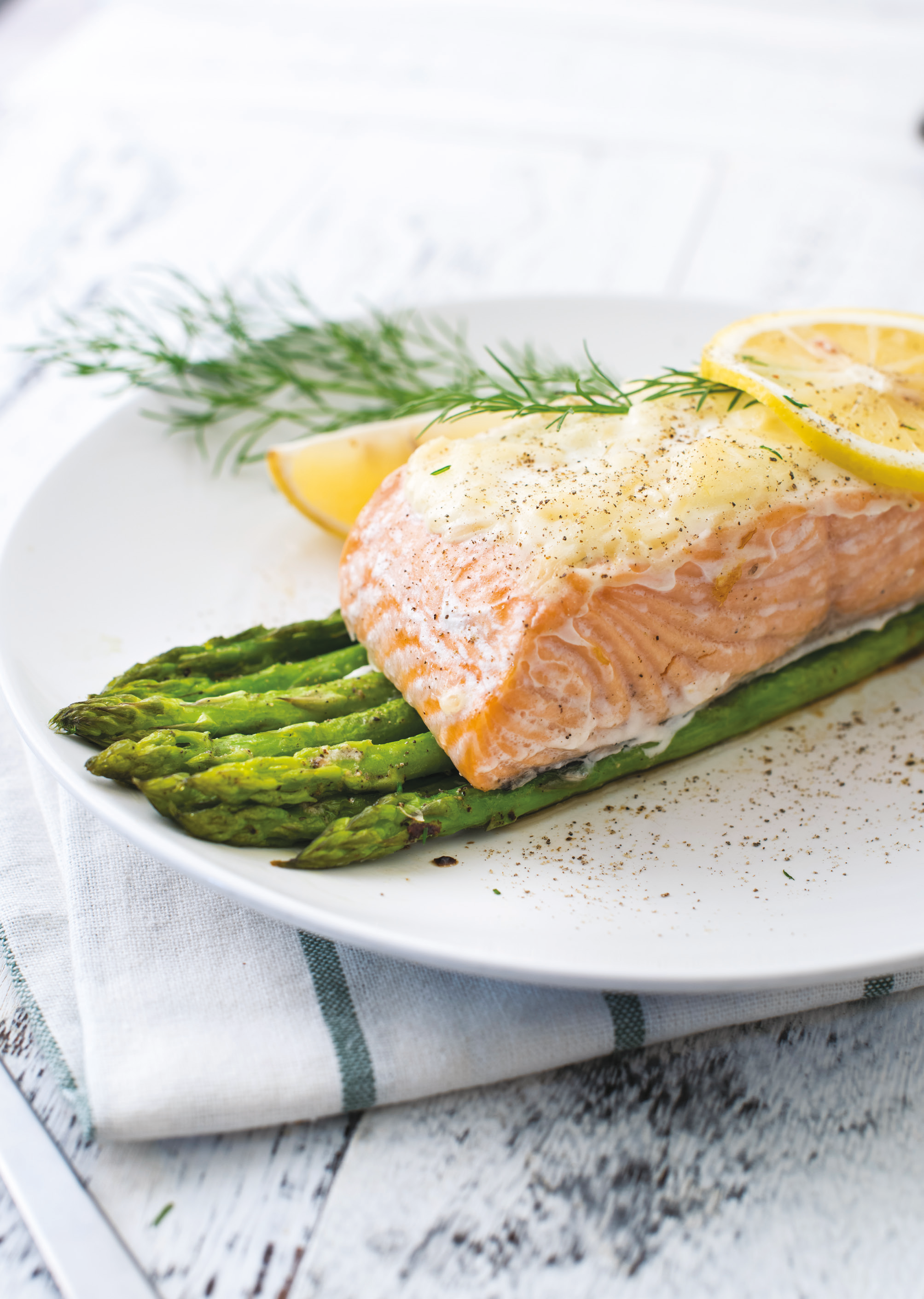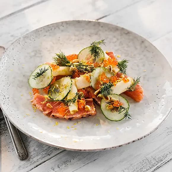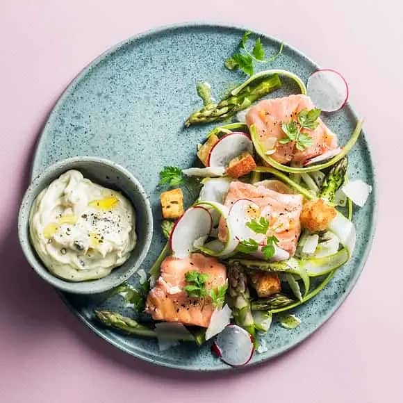 Konfiterad lax med rå sparrissallad och kaprismajonnäs