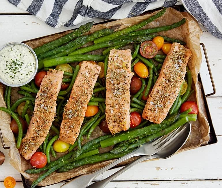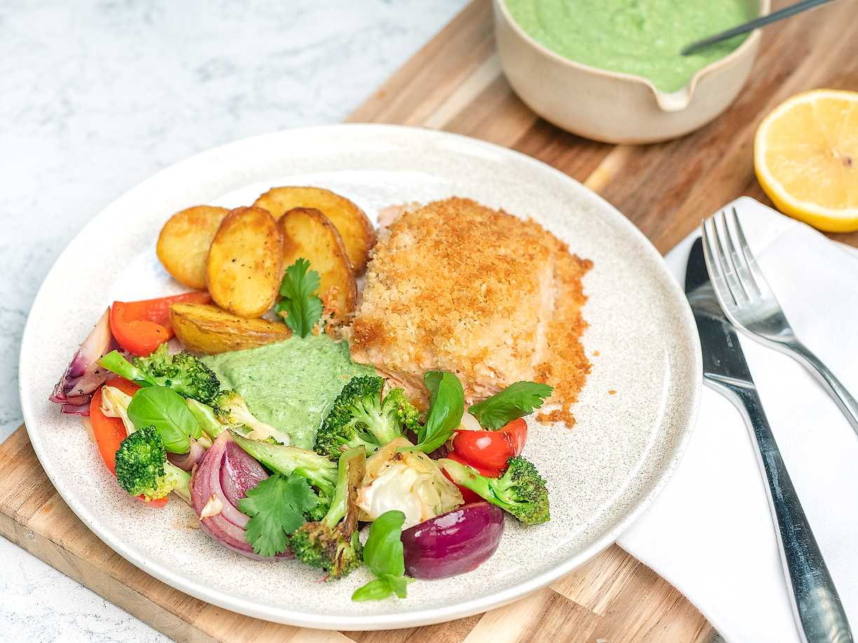 Ugnsstekt lax med rostad brysselkål och basilikakräm