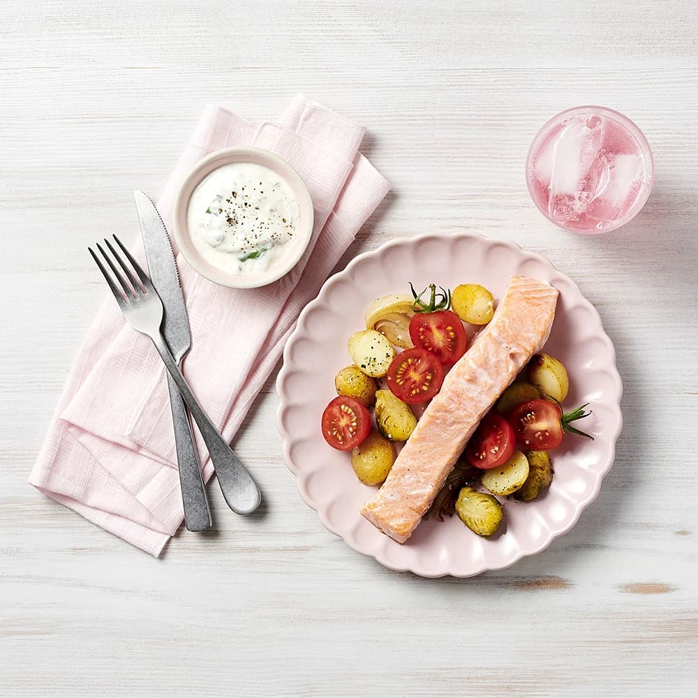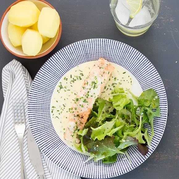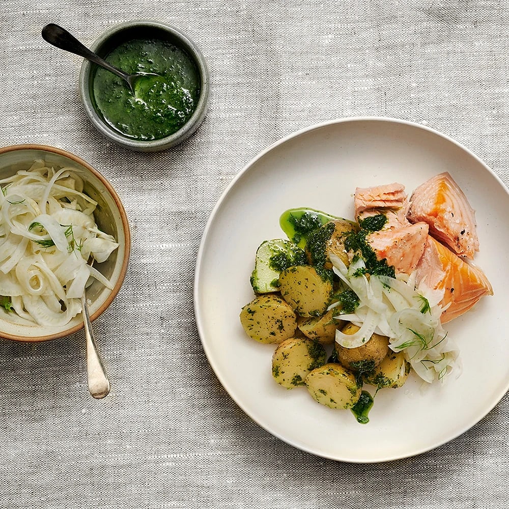 Snabbrimmad lax med dillstuvad potatis och fänkålscrudité