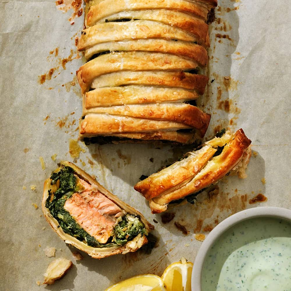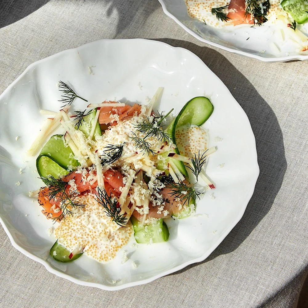 Ugnsbakad lax med gurk-och fänkålssallad samt brynt smörkräm