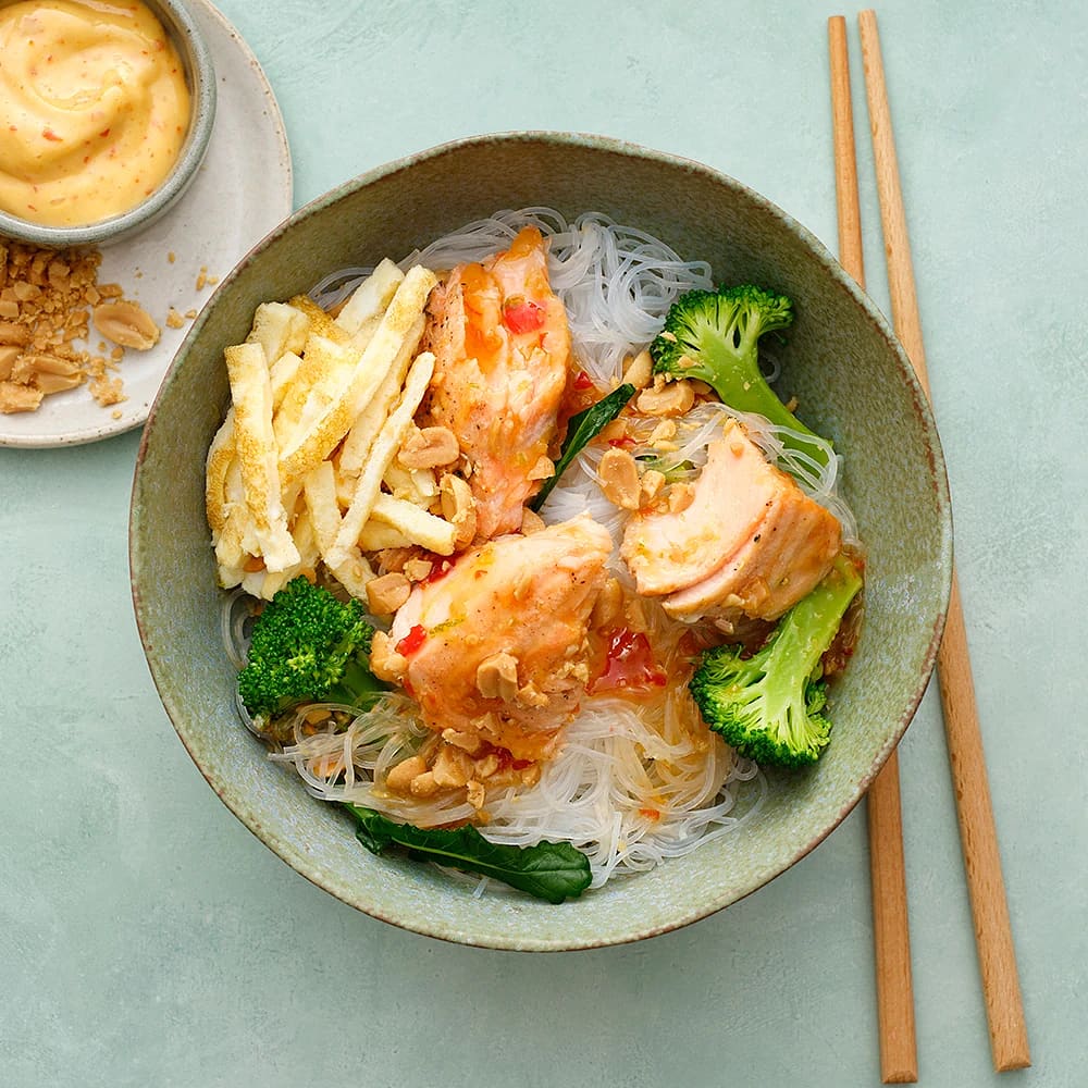 Glasnudelsallad med sweet chilimarinerad lax och jordnötter