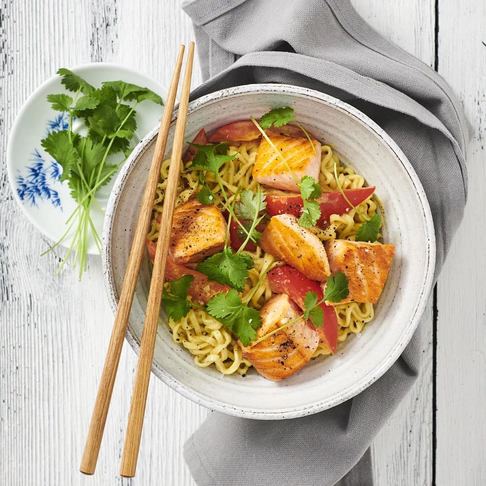 Krämiga currynudlar med lax och paprika