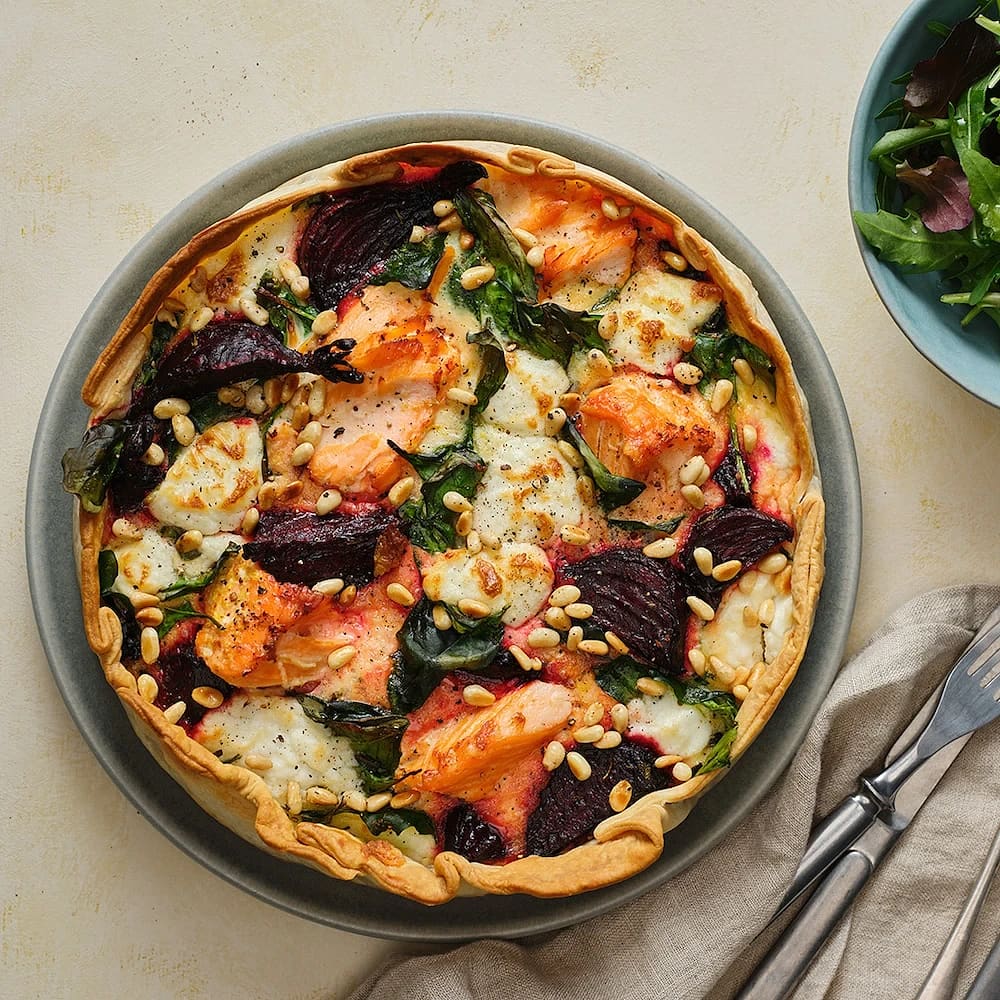Paj med rödbetor, getost och lax