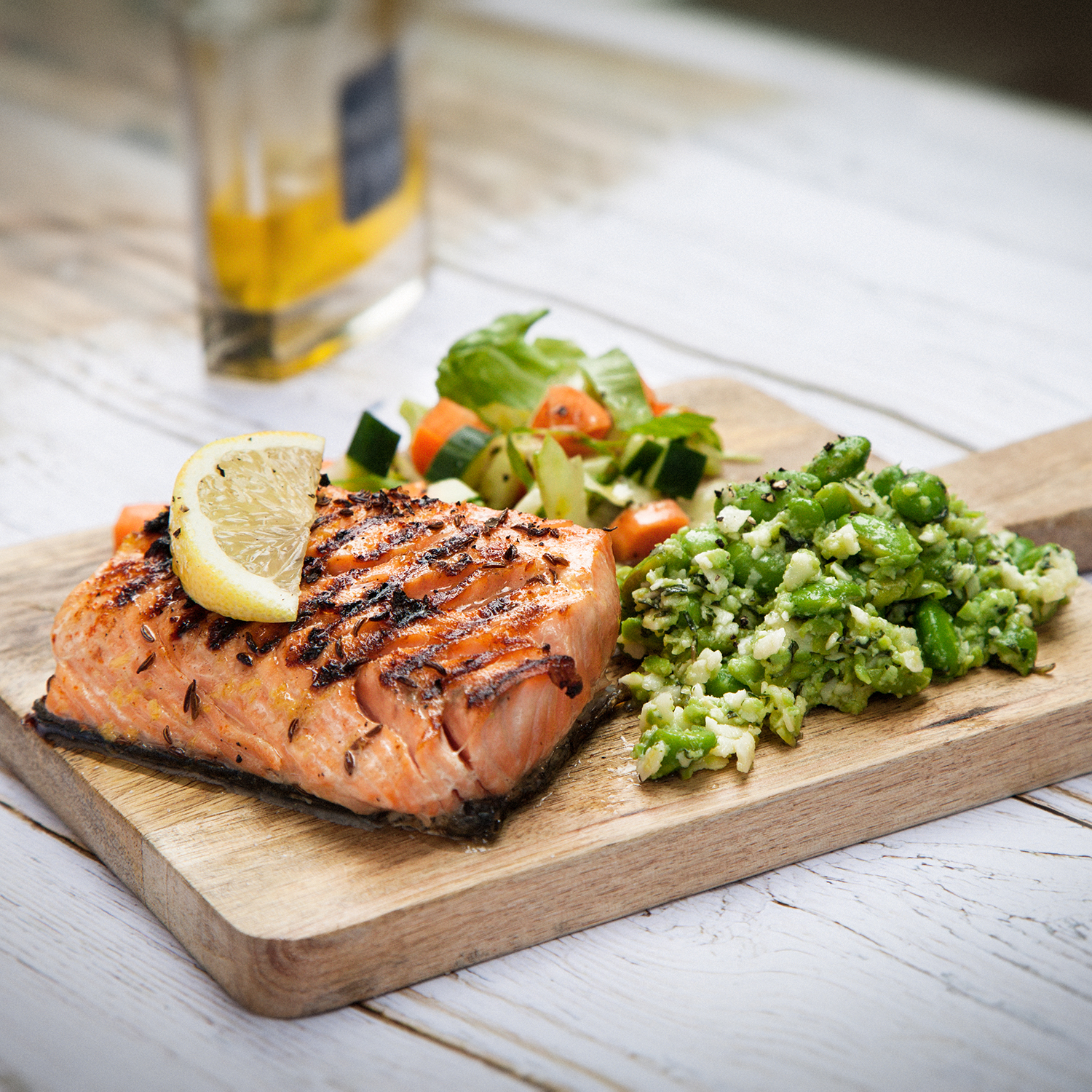 Chili-och kummingrillad lax med edamamehummus