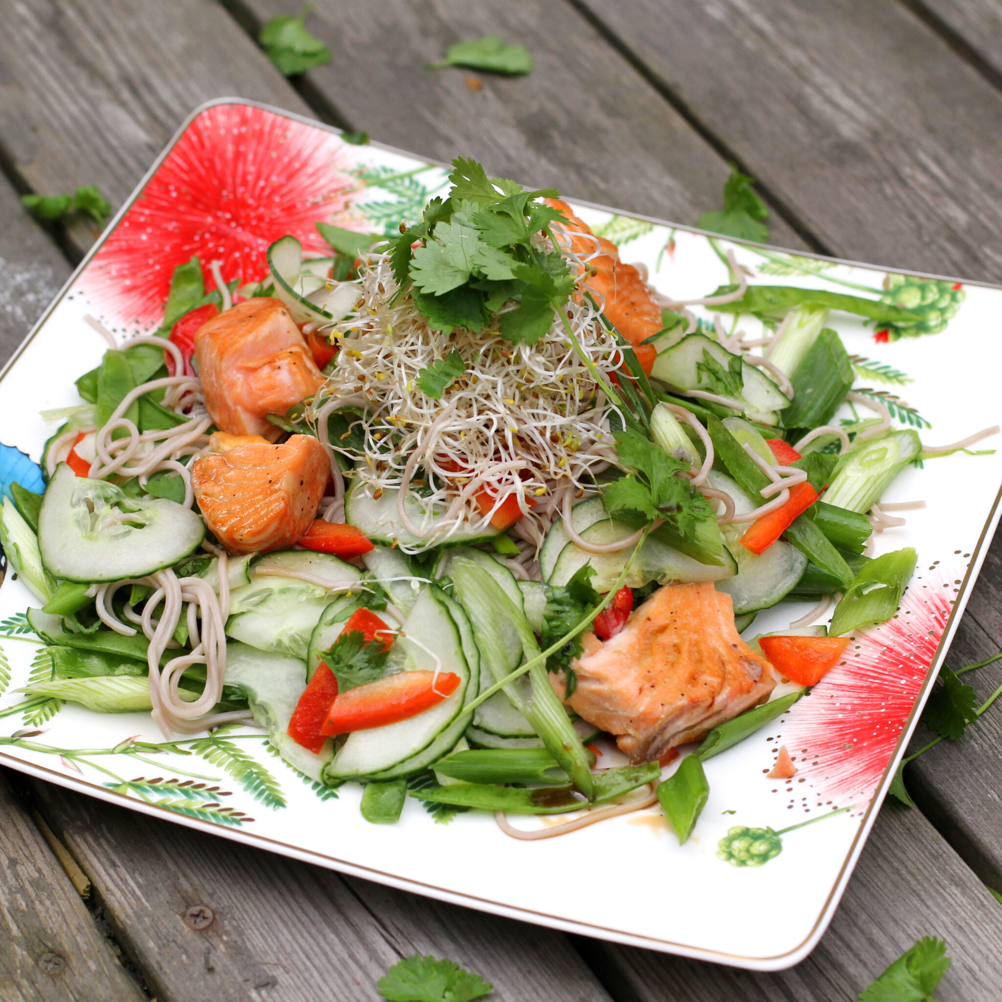 Sötsalt lax serverad på sobanudelsallad