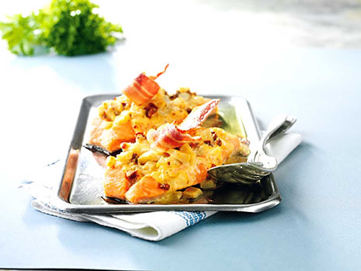 Ost- och morotsgratinerad lax med potatis