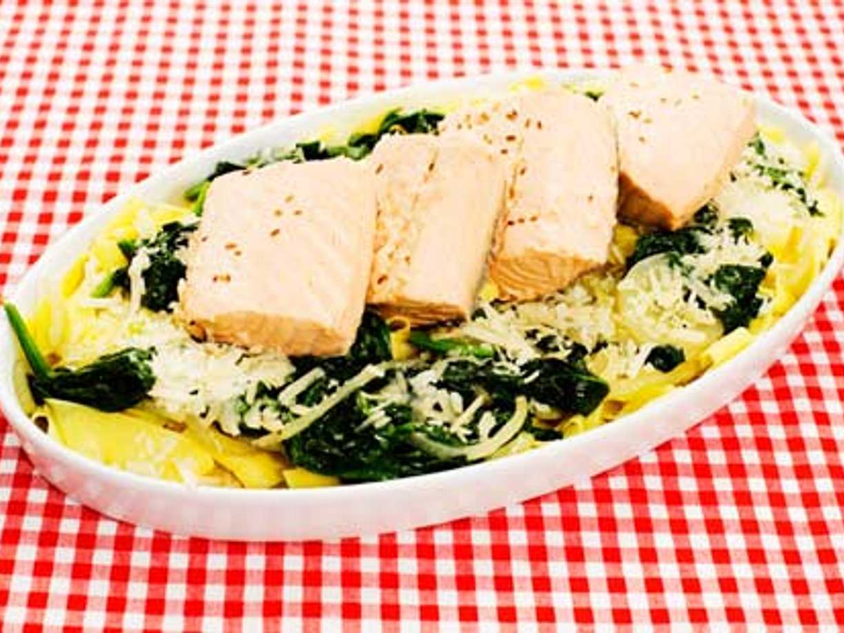 Pastagratäng med rökt lax och spenat