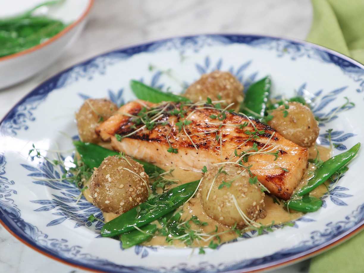 Sockersotad lax med brynt sojahollandaise och sesampotatis