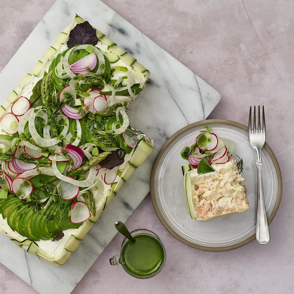 Smörgåstårta med varmrökt lax, räkor och pepparrot