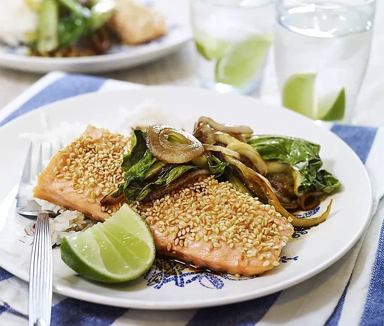 Sesambakad lax med ris