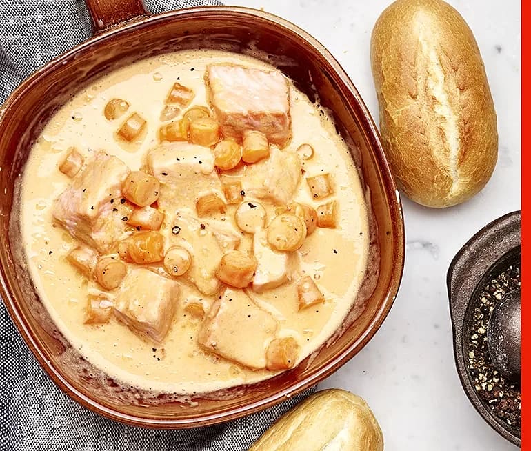 Fiskgryta med lax och minibaguette