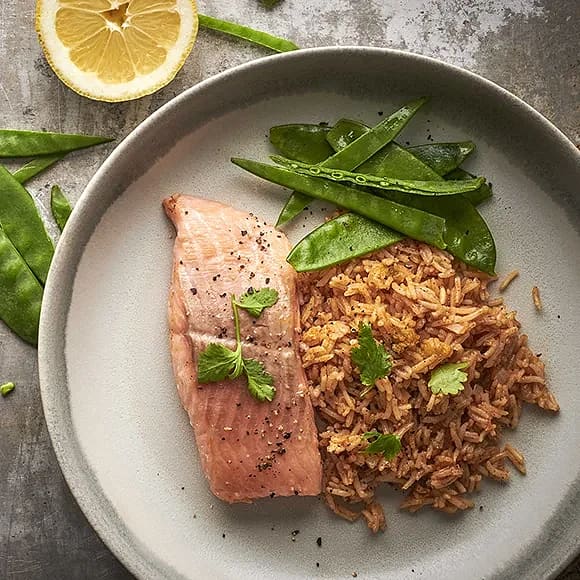 Kryddigt ris med lax och sockerärtor