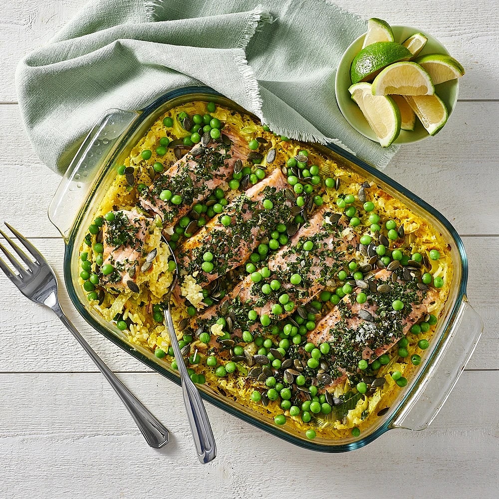 Allt i en form - persiljebakad lax med blomkålsris