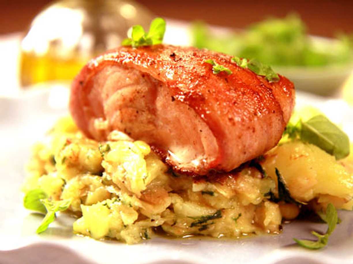 Baconlindad lax med vitlöksfräst spenat