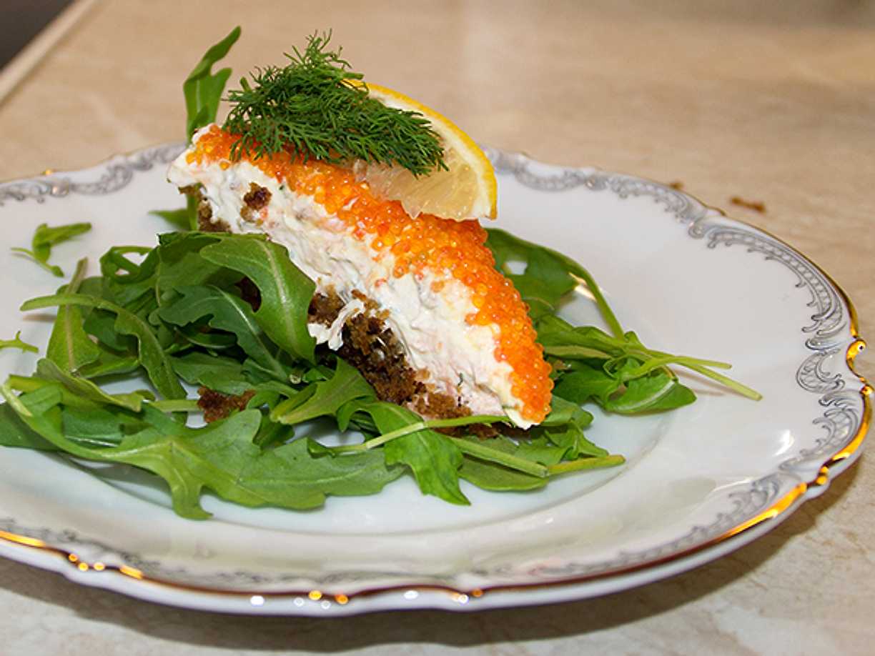 Cheesecake med lax på rucolabädd