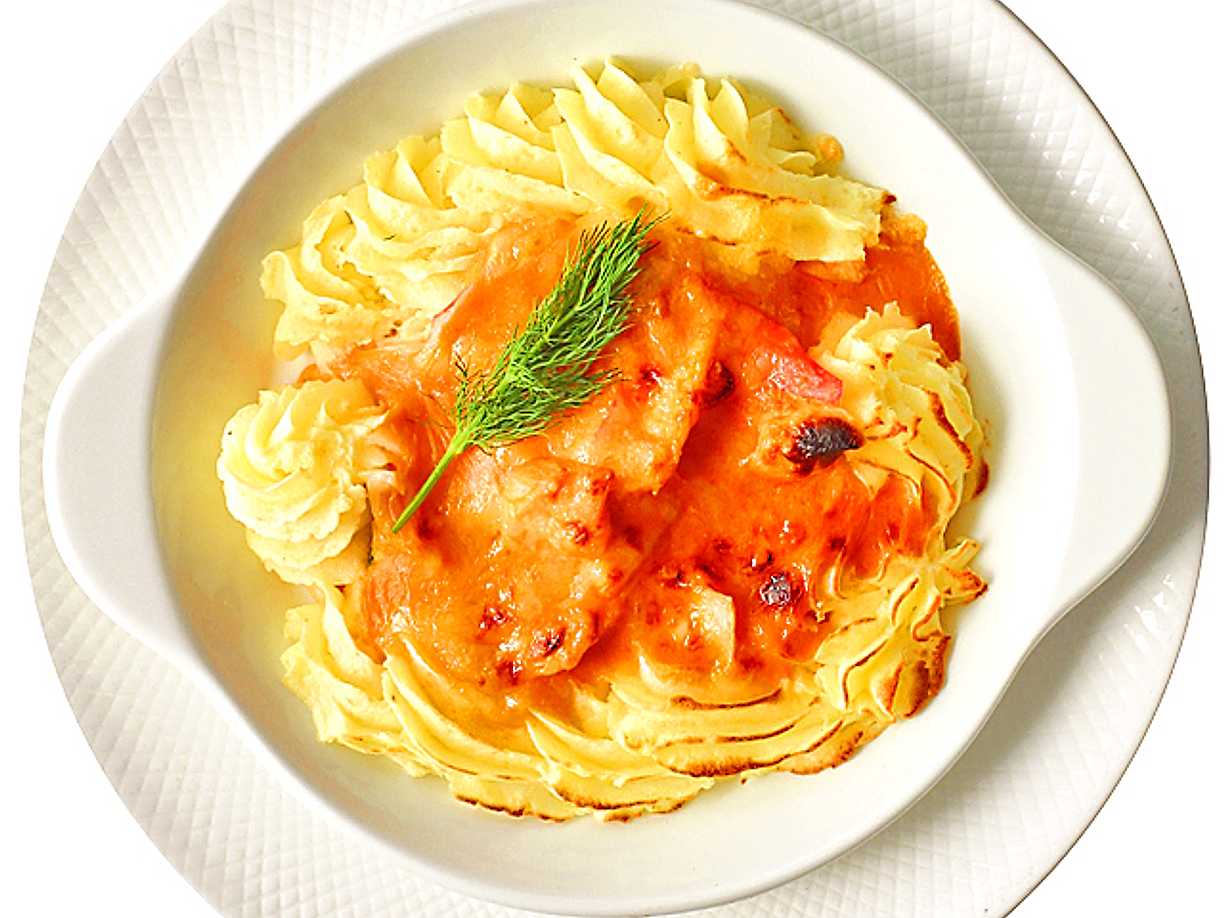 Fiskgratäng med lax och skaldjur