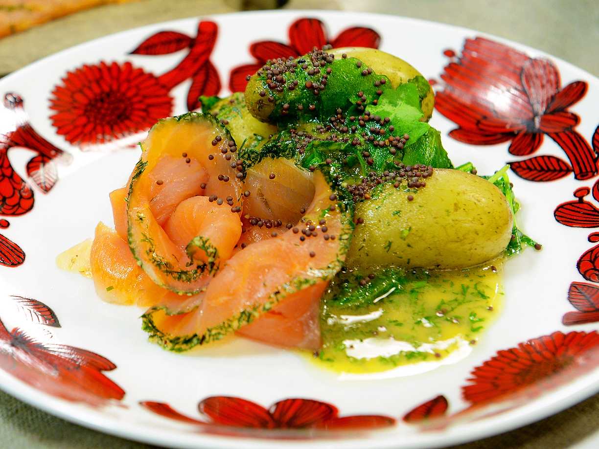 Halstrad gravad lax med senapsstuvad potatis