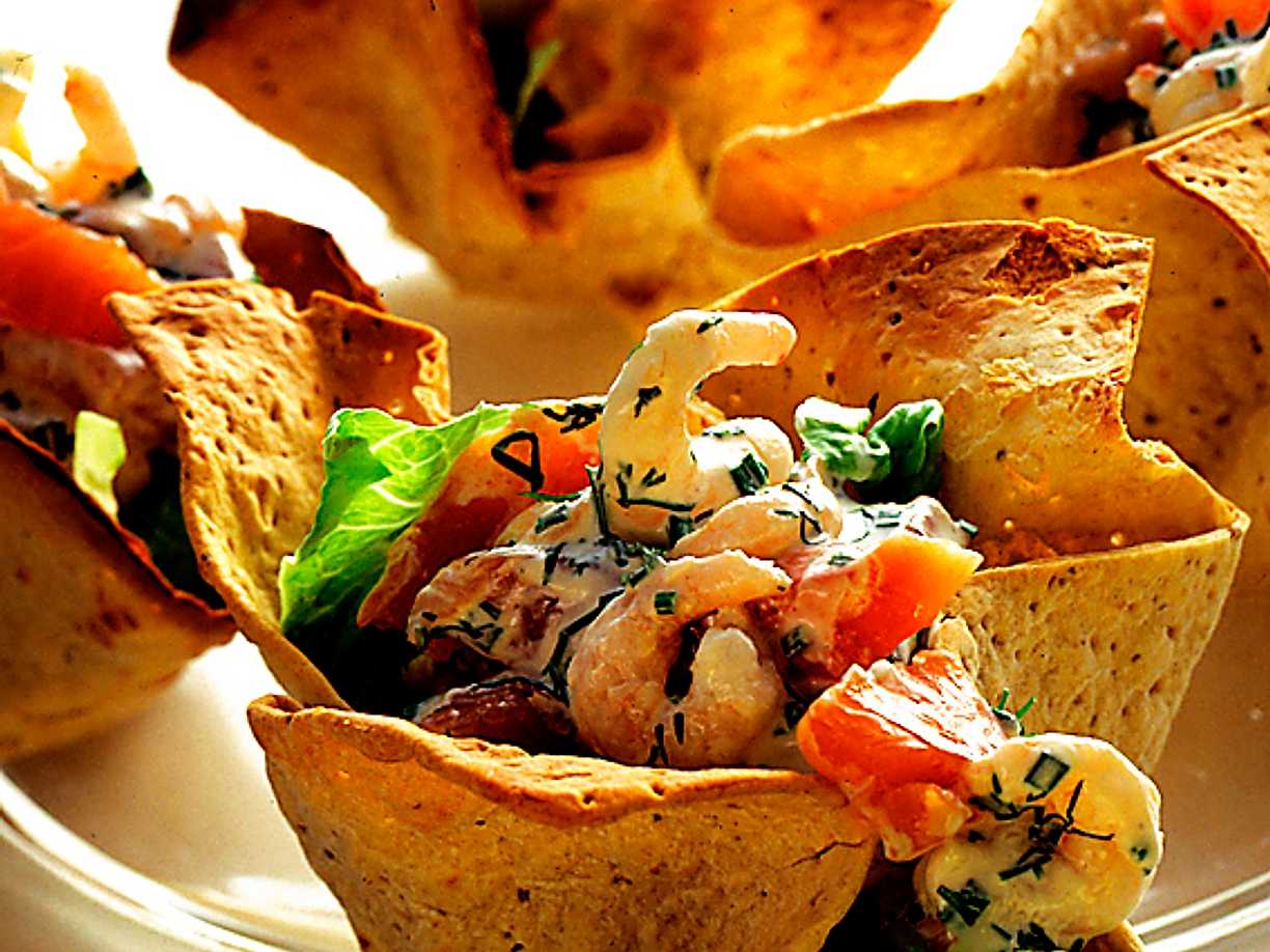 Tunnbrödskorgar med lax och räkor