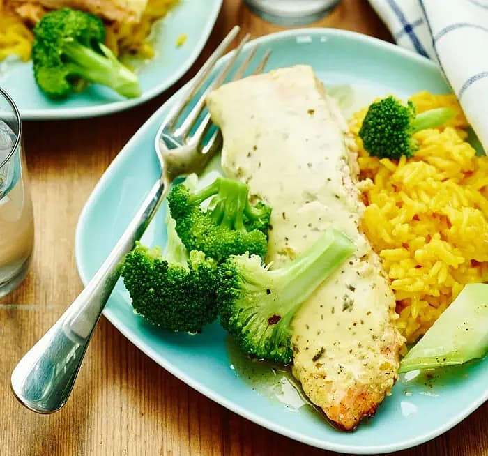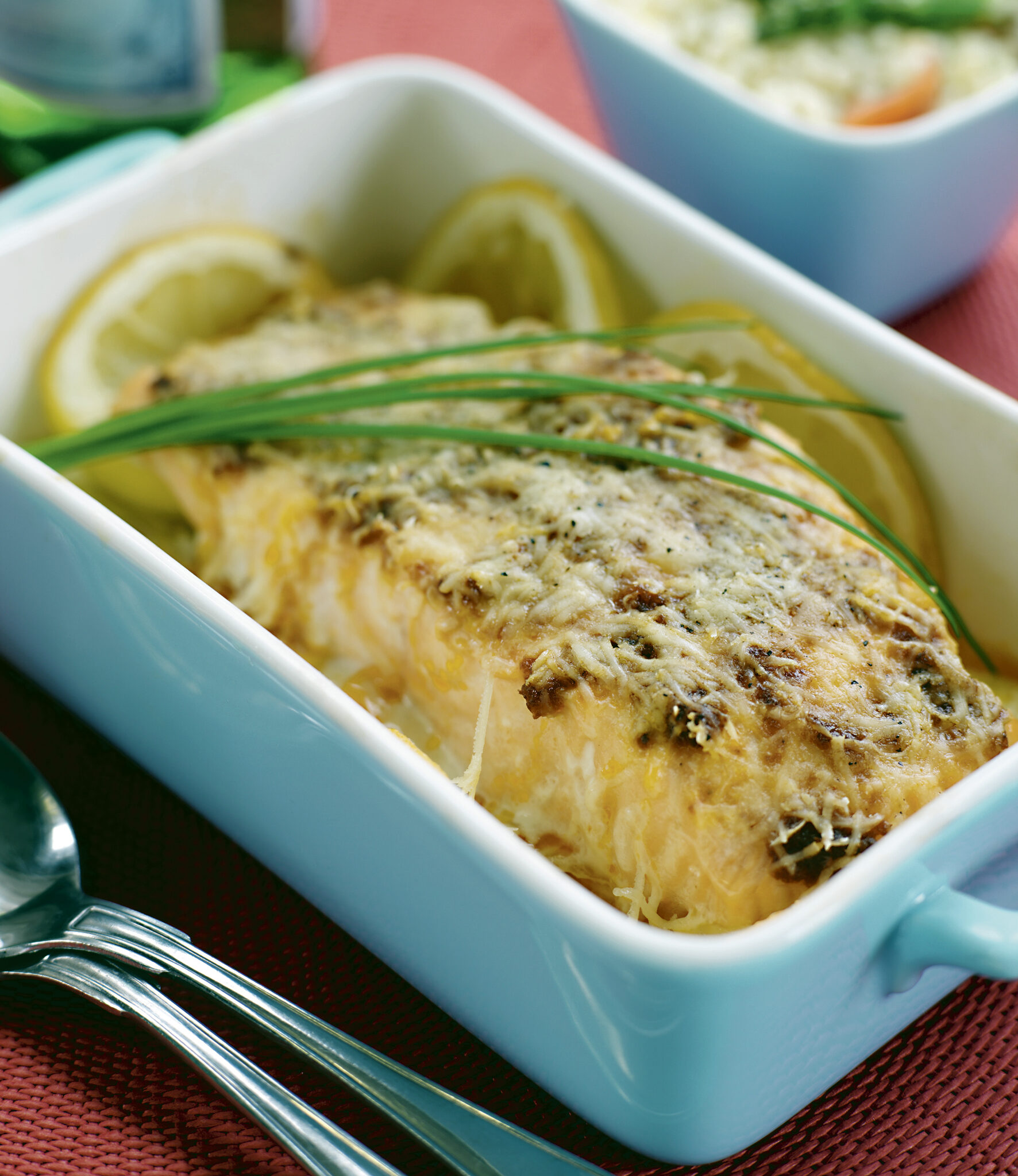 Citron- och färskostbakad lax med smörstekt spenat och mandel