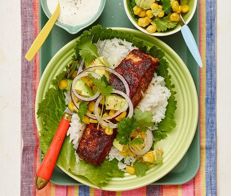 Stekt lax med het majs och zucchinisallad toppad med fetaost