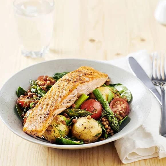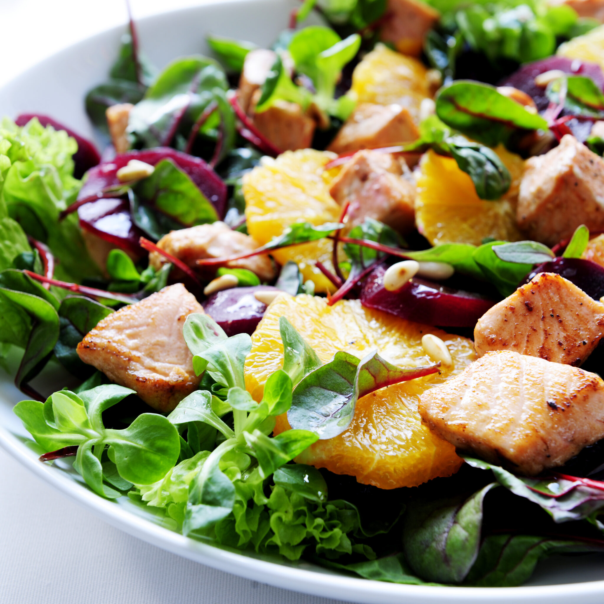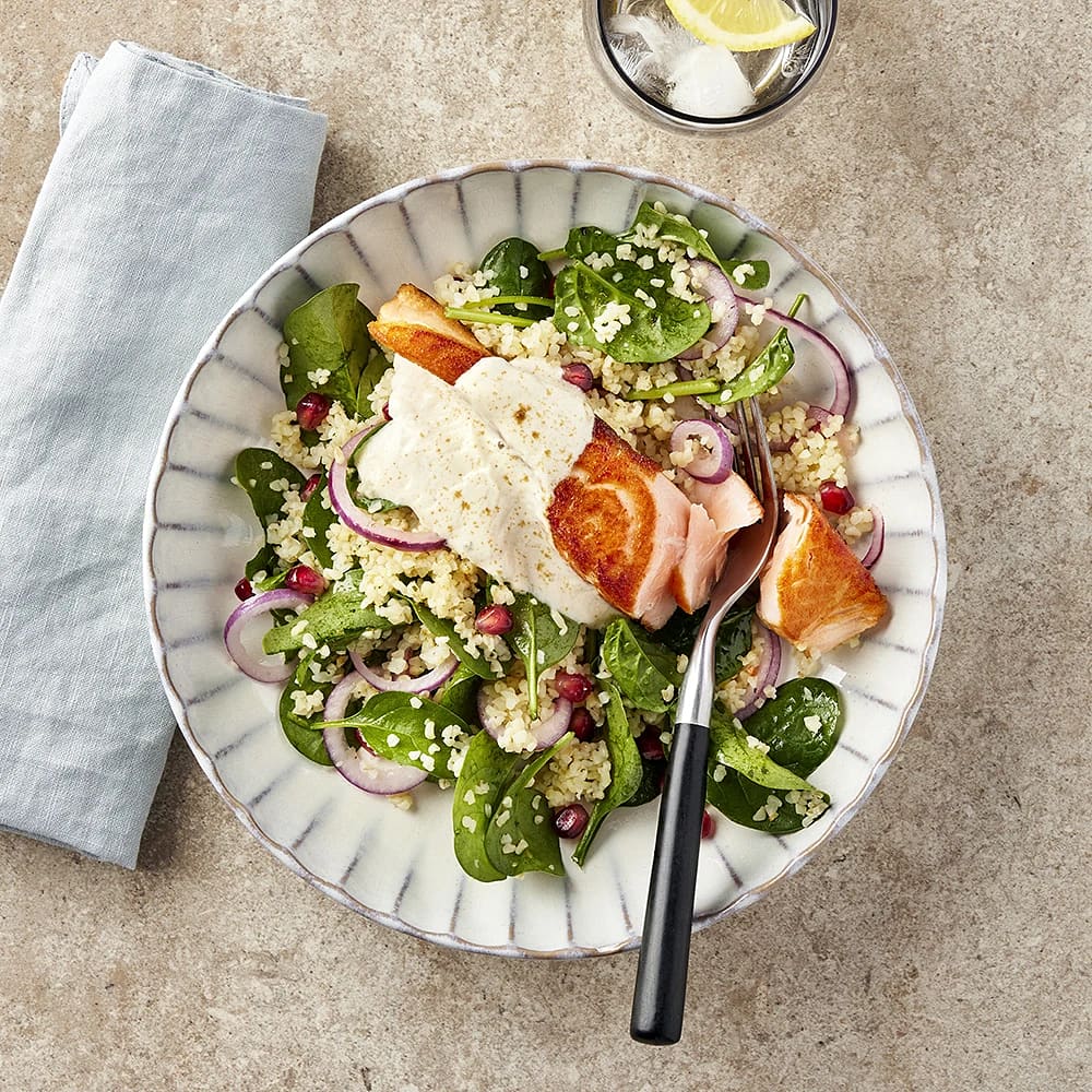 Quinoa- och bönsallad med fänkål och varmrökt lax