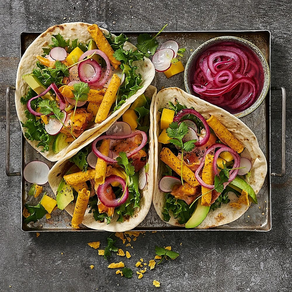 Curry- och bönpannkakor med rökt lax och rödlöksdipp