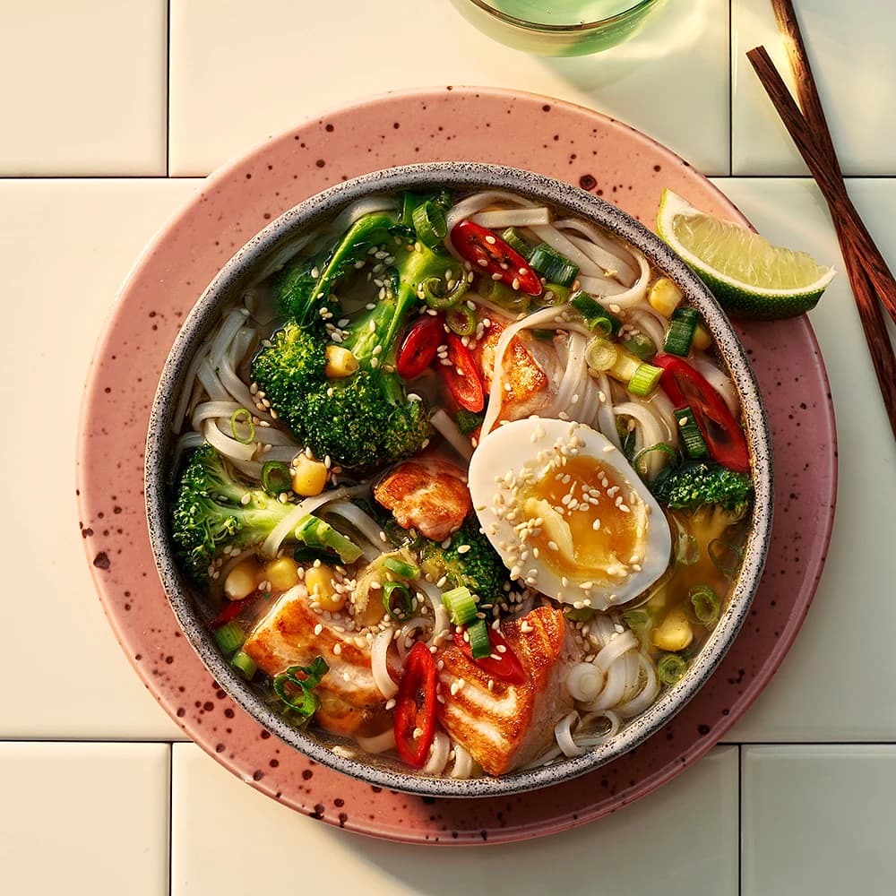 Fetaostbakad lax med basilikadressad grönsakspasta