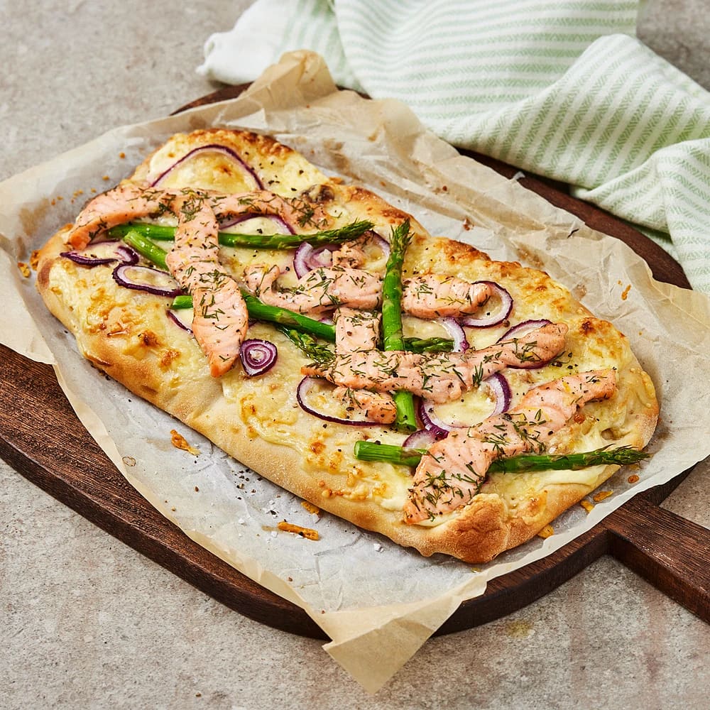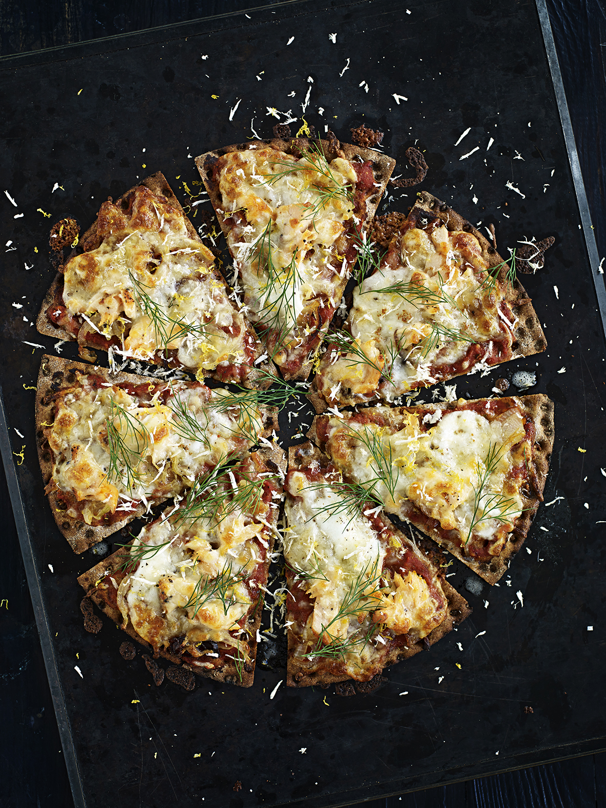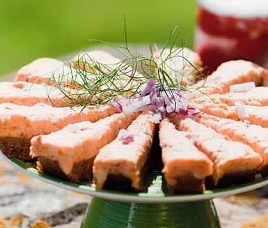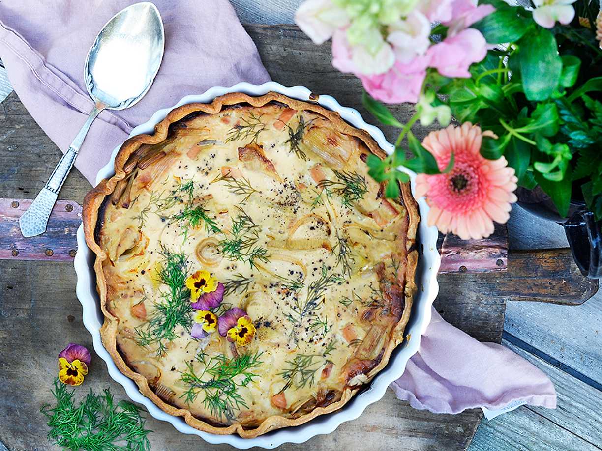 Västerbottensostpaj med rökt lax, rädisor och gurka
