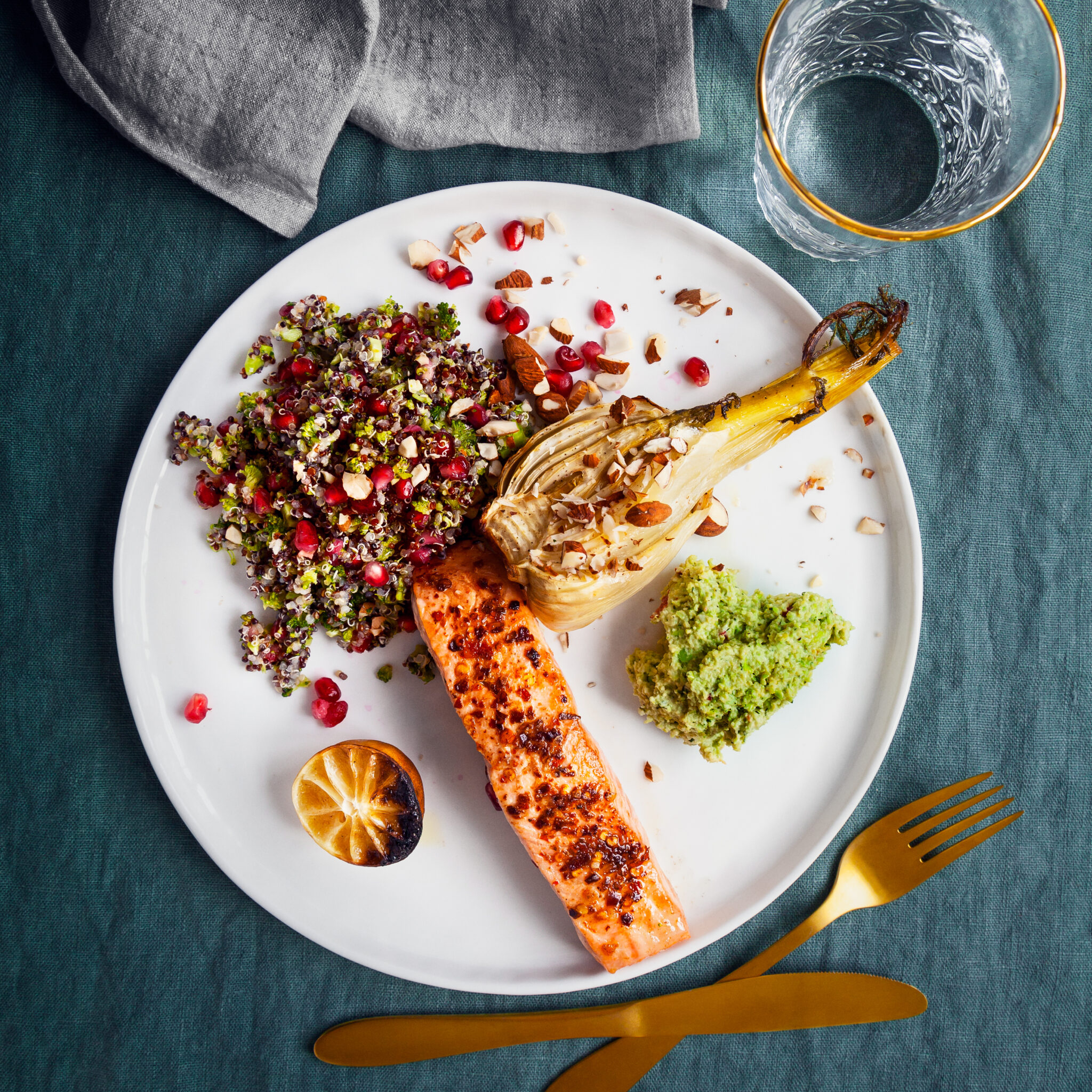 Chilistekt lax med bakad fänkål och broccoli- och granatäppelsallad