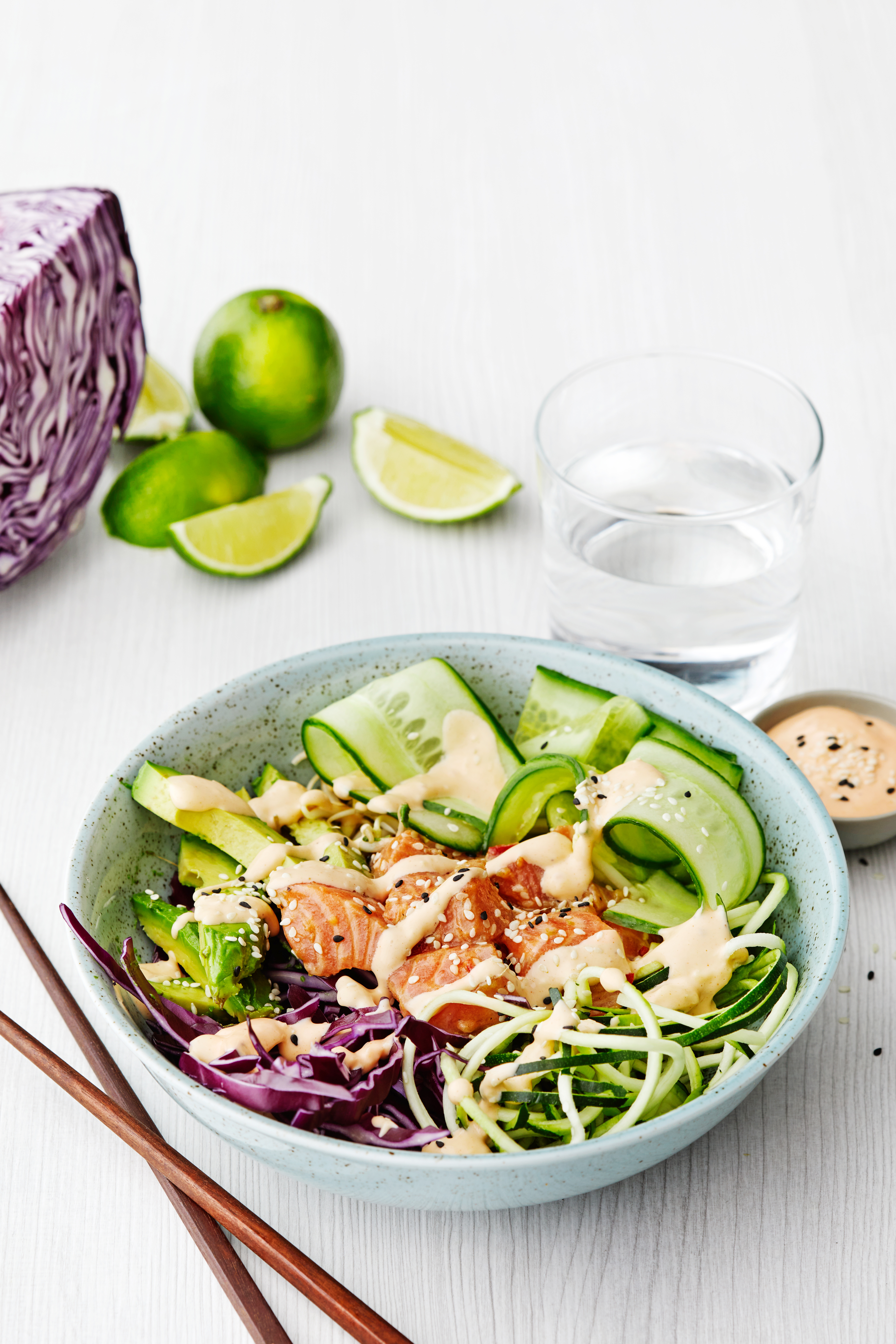 Sesampanerad lax med ponzumajonnäs och krispig sallad