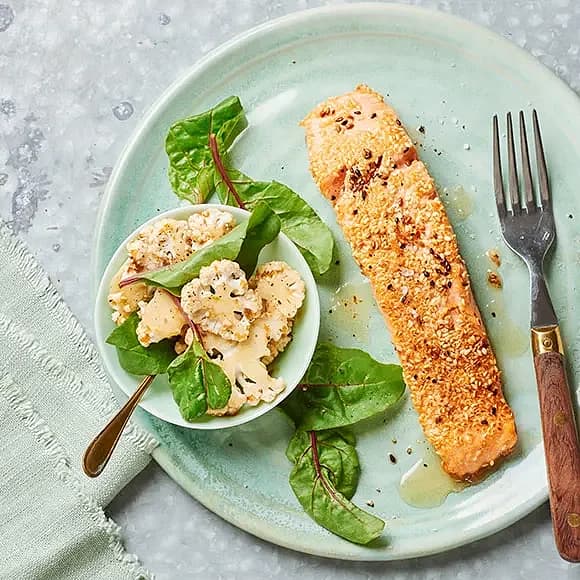 Sesamstekt lax med blomkål och lime- och sojadressing
