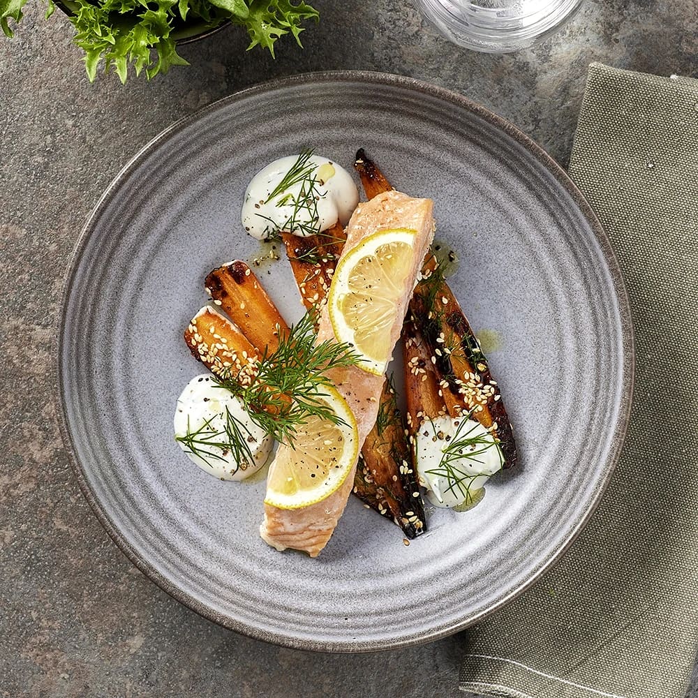 Citronbakad lax med dillrostade morötter