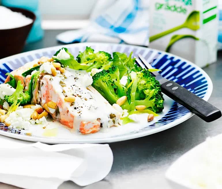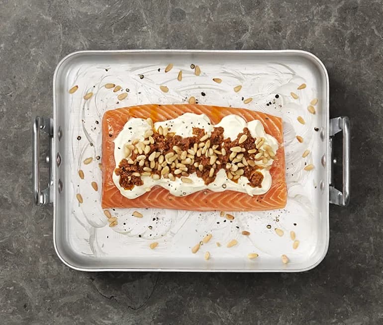 Lax med pesto, crème fraiche och pinjenötter