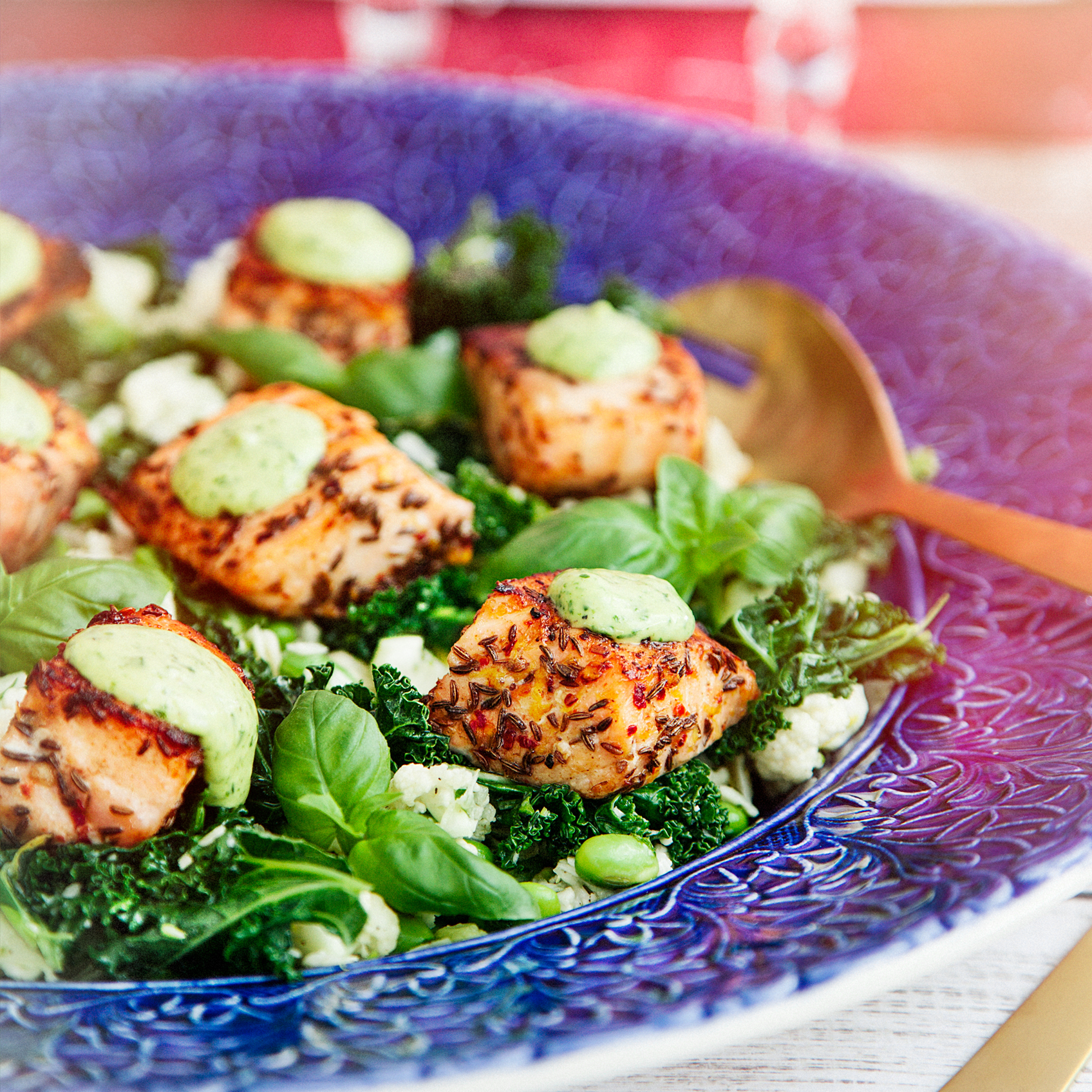 Kumminstekt lax med blomkålsallad med parmesan samt basilikadipp