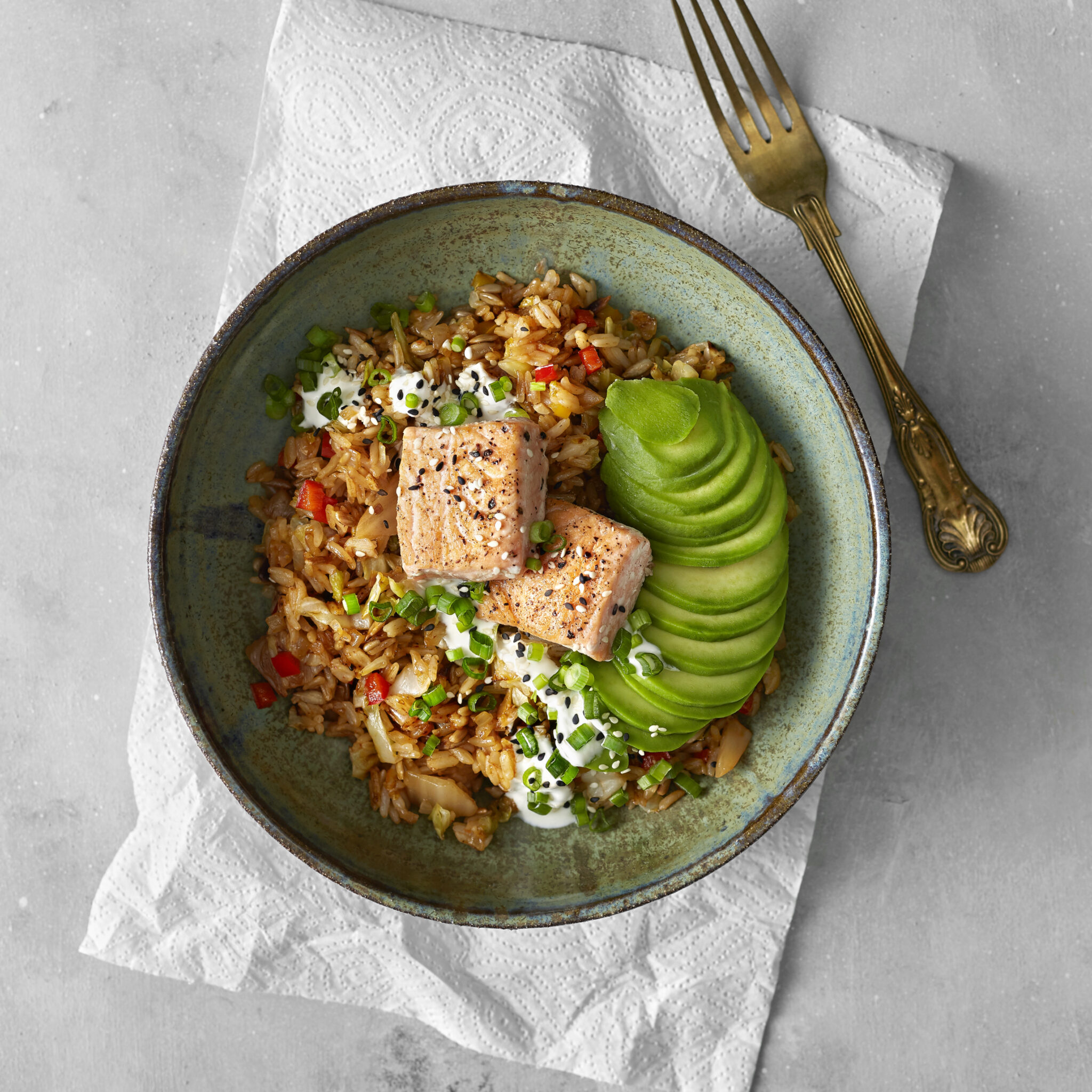 Kimchiris med hackad paprika, lax, avokado och limeyoghurtsås