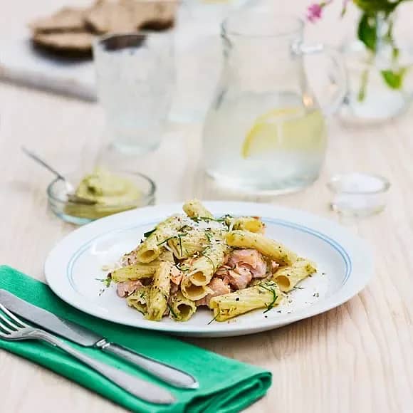 Pasta med pestohummus och ångad lax