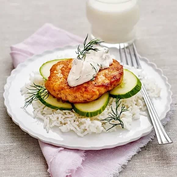 Laxbiffar med dilltzatziki och blomkålsbulgur