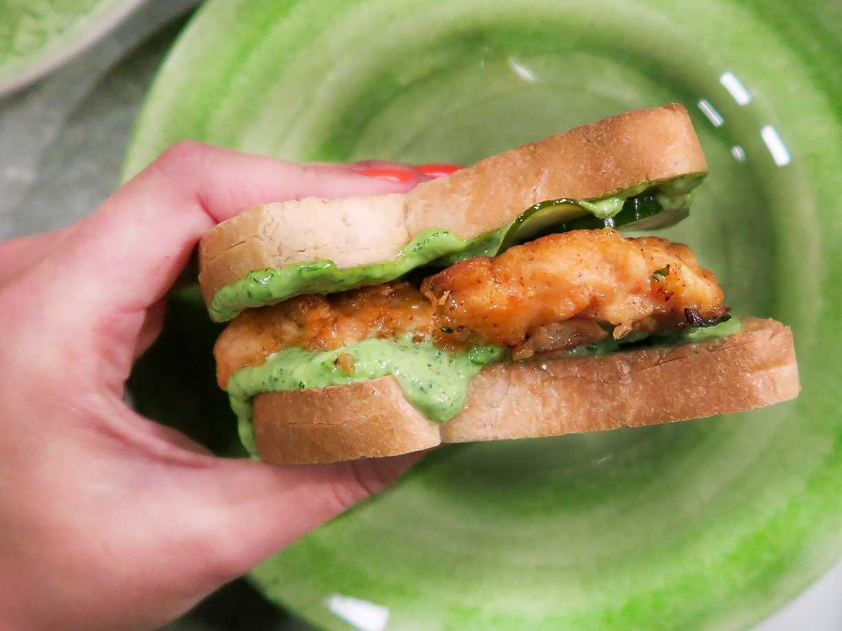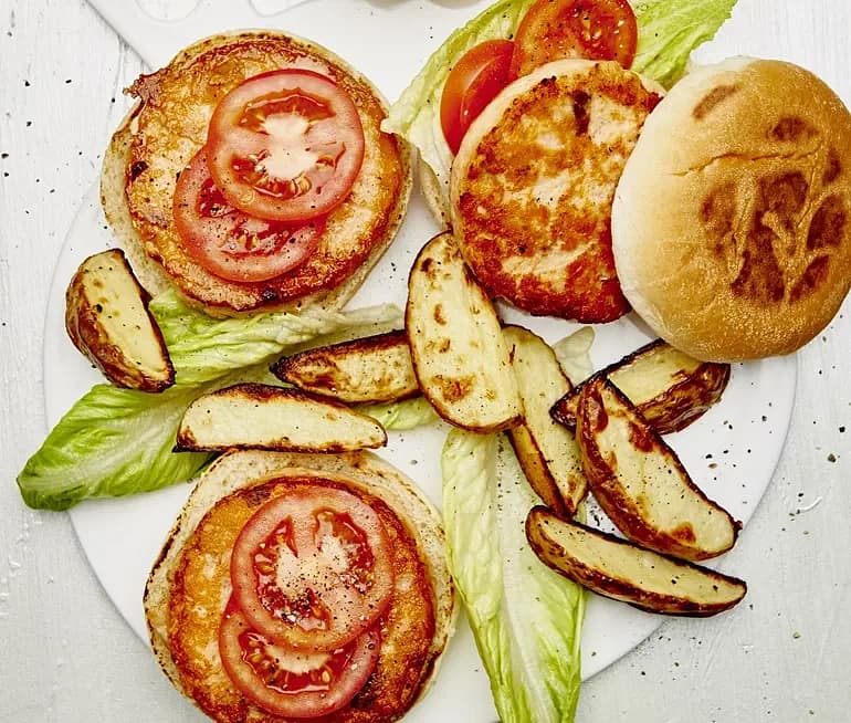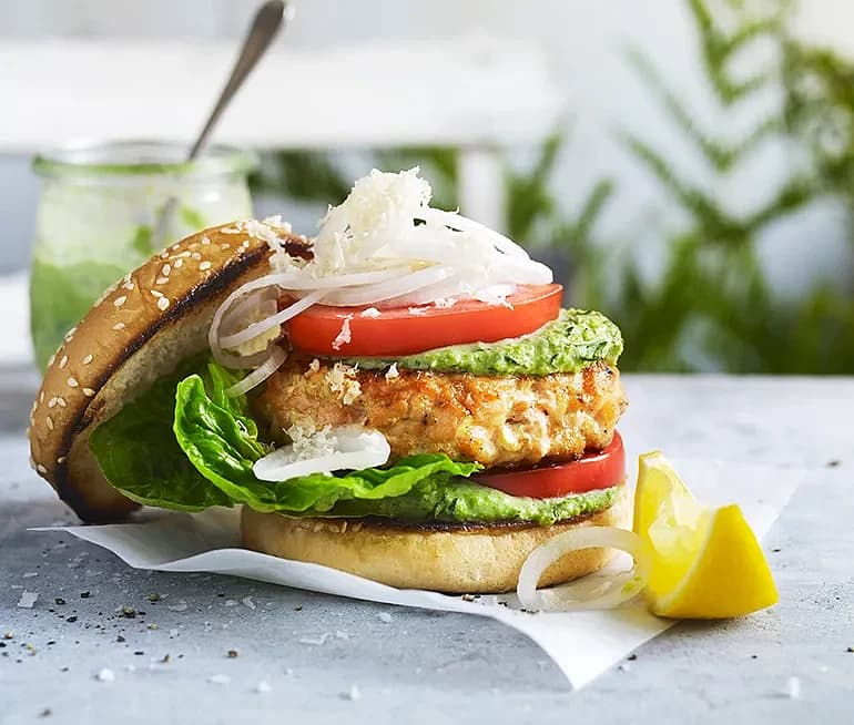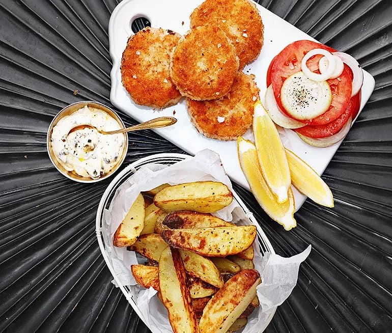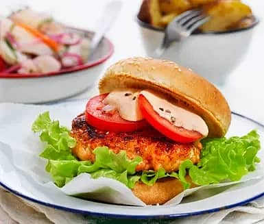 Laxburgare med hemgjord dressing, pickles och rostad potatis