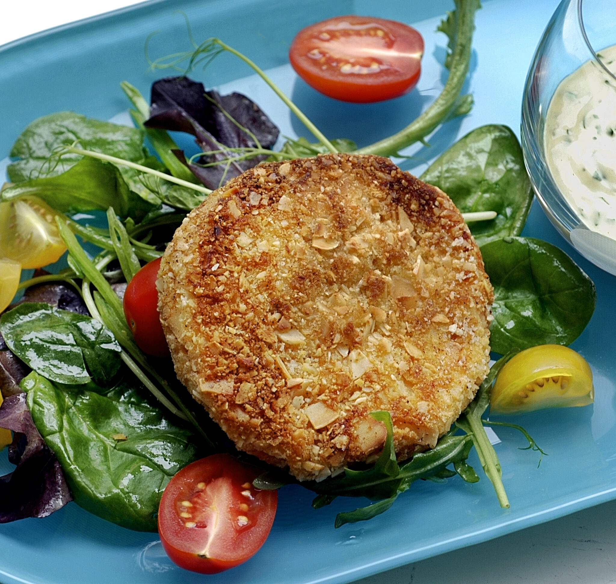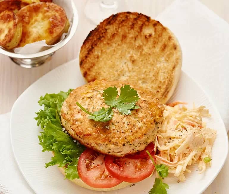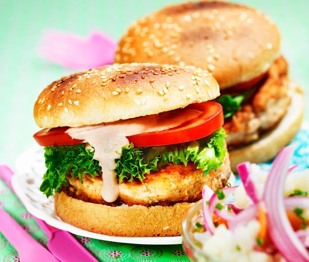 Sesampanerad laxburgare med fänkålssallad samt kapris- och dijonsås