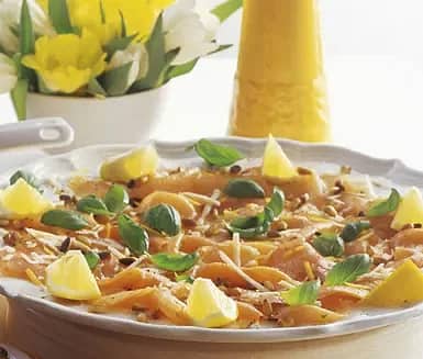 Laxcarpaccio med rostade pinjenötter och basilika