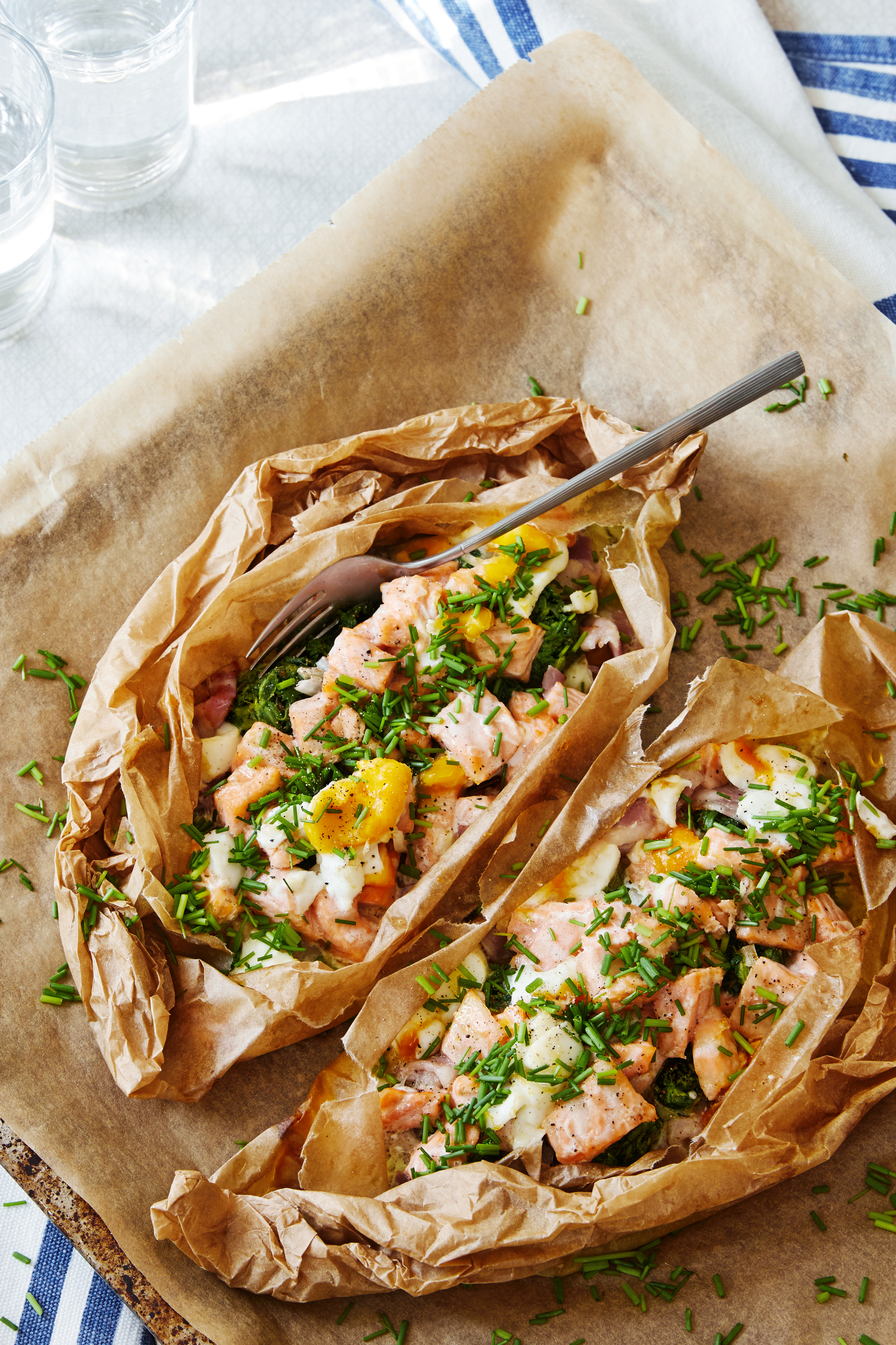 Visar placering 6–8 av de högst betygsatta recepten med laxpaket.
