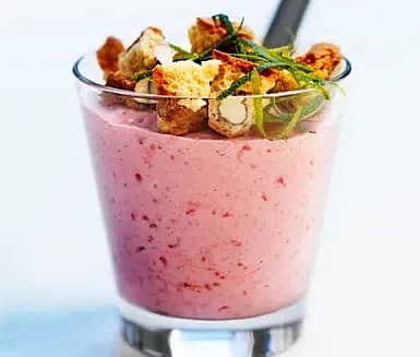 Kall gurksoppa med kokosmjölk, lime och räkor på spett