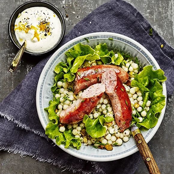 Kryddig råkorv med grillad grönsakscouscous och lime- och chiliyogurt