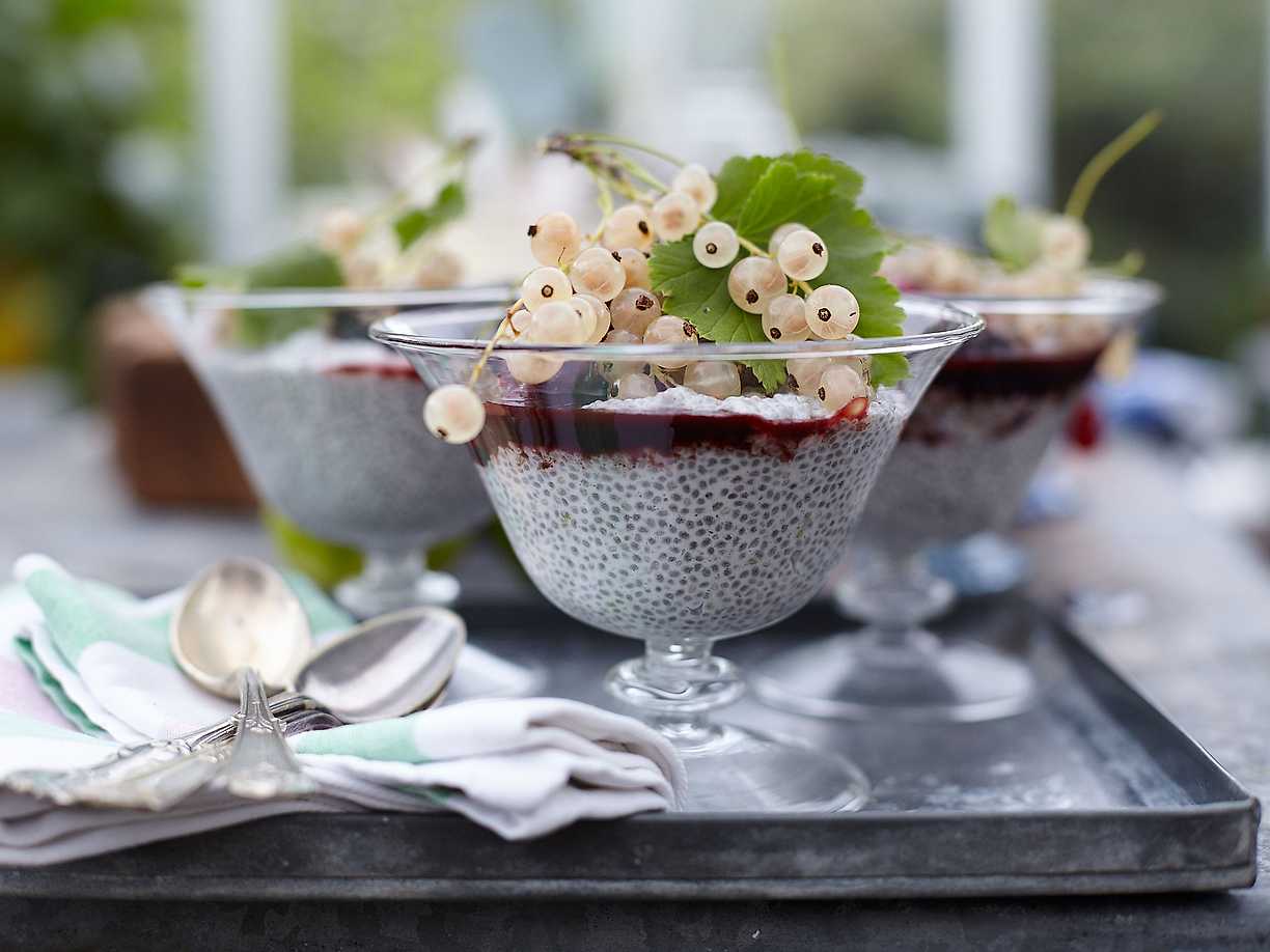 Chiapudding med kokos, lime och lakritsmarinerade bär