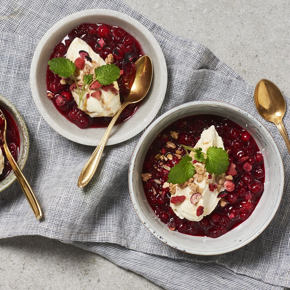 Saffranspannacotta med lingon, glögg och rosèpeppar