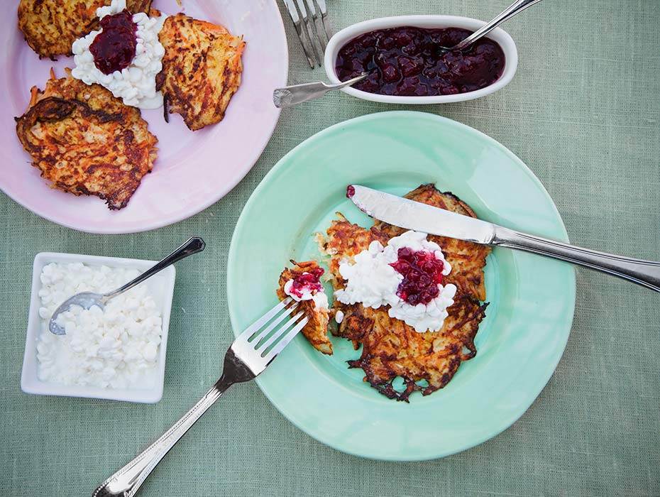 Raggmunk med purjolök, grönkål och rårörda lingon